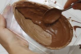 Depois é só colocar uma pequena quantidade na forma e ir espalhando o chocolate até que pare de escorrer, cubra com papel alumínio . vire-o para baixo, leve-o à geladeira para secar. Repita esse processo 3 vezes ou mais, a fim de que fiquem grossinhas as paredes dos ovos.